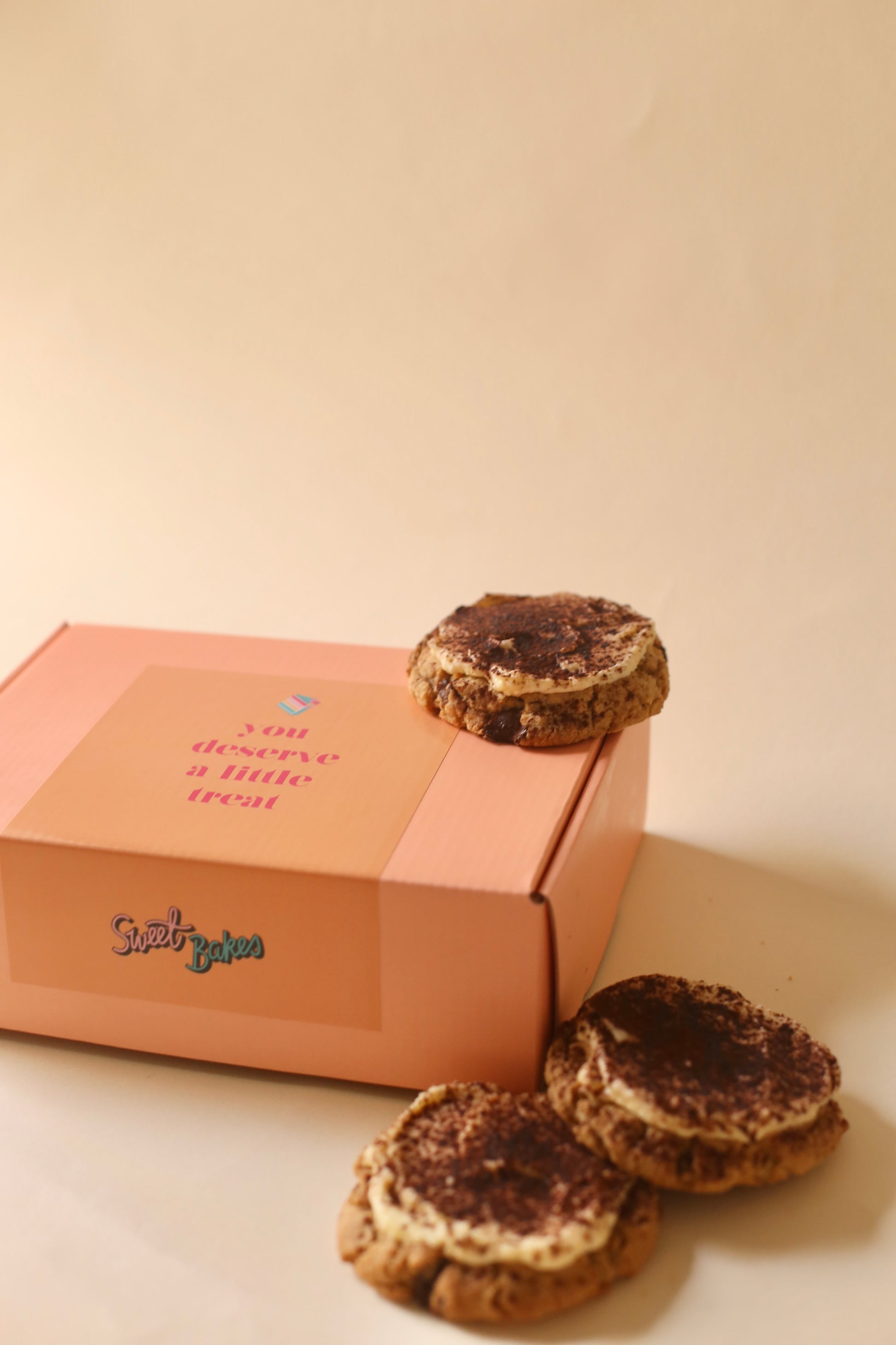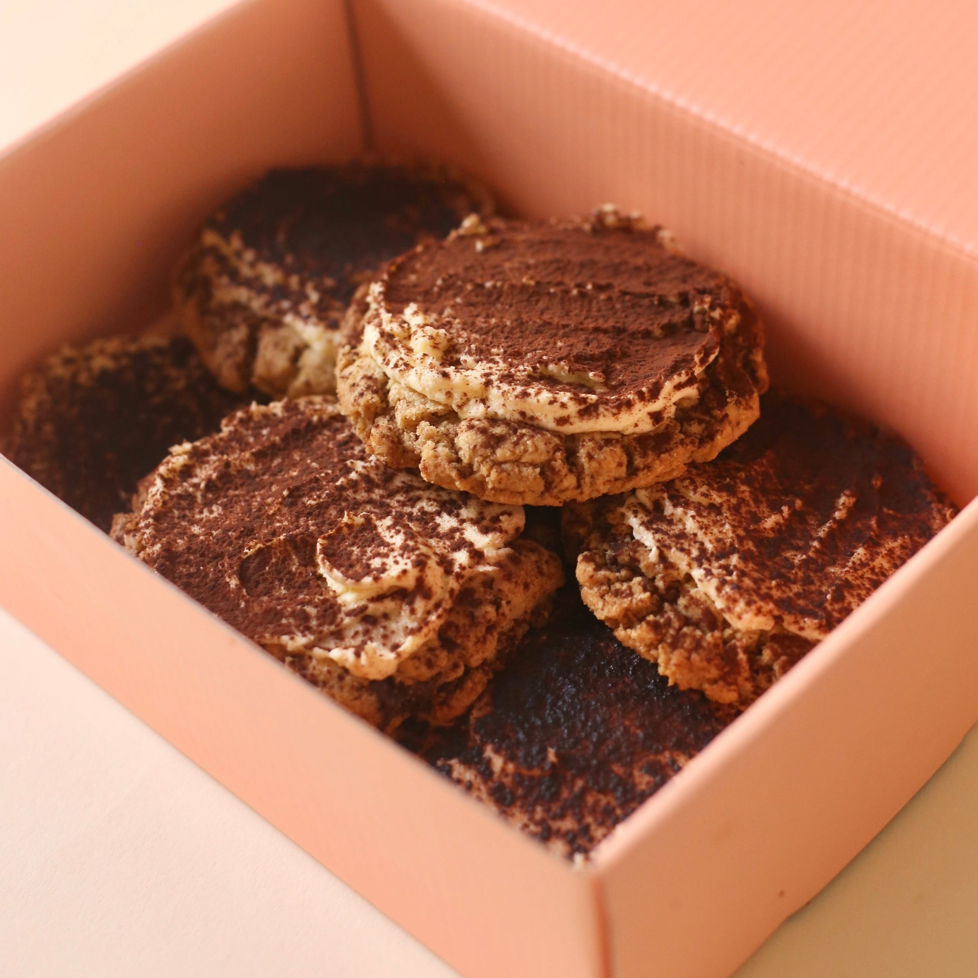 Our incredible XL squishy chocolate chip cookie is made with marscapone, espresso & Belgian chocolate - it's tender and utterly delicious. Covered in tiramisu topping and dark coco powder. Okay I’m drooling.